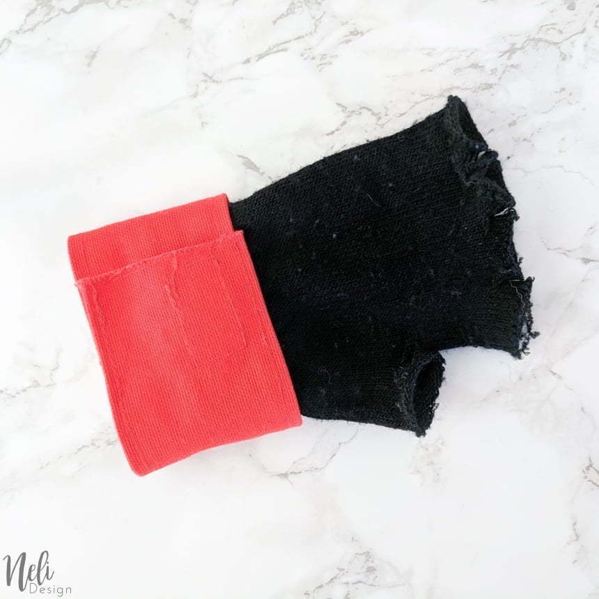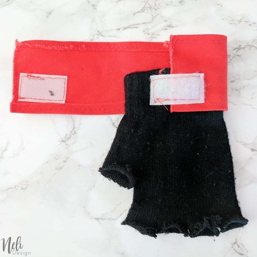 So this is important: Since the gloves are stretchable, you can't just sew (or tape!) a red fabric all around. You need to take into consideration the elasticity of the gloves. You want your kid to be able to put on the gloves.