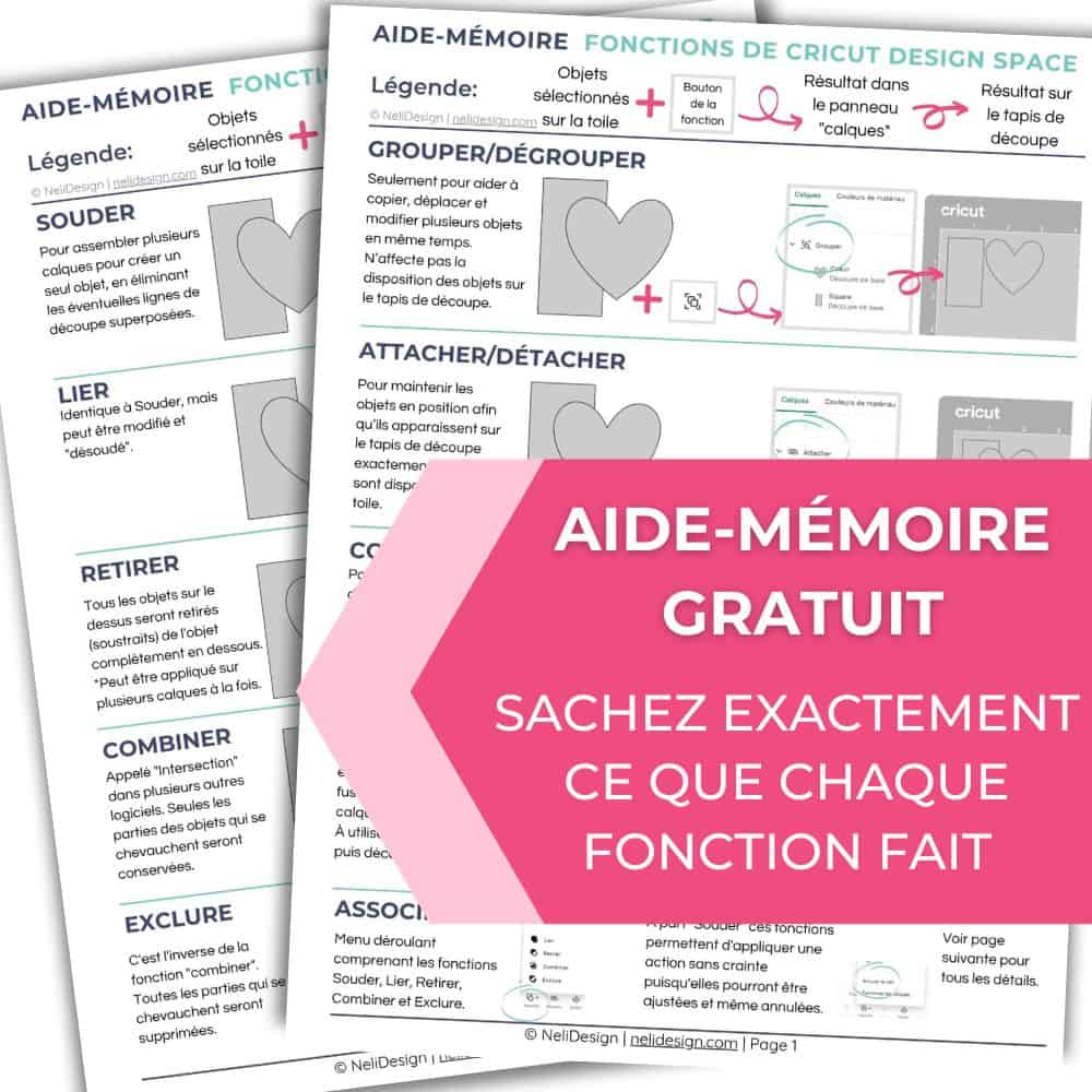 Commencez par télécharger votre aide-mémoire Cricut gratuit. Il vous aidera à savoir en un coup d'œil ce que fait chaque fonction essentielle de Cricut Design Space. Comme la différence entre Grouper et Attacher. Et comment utiliser, Souder, Couper et Aplatir.