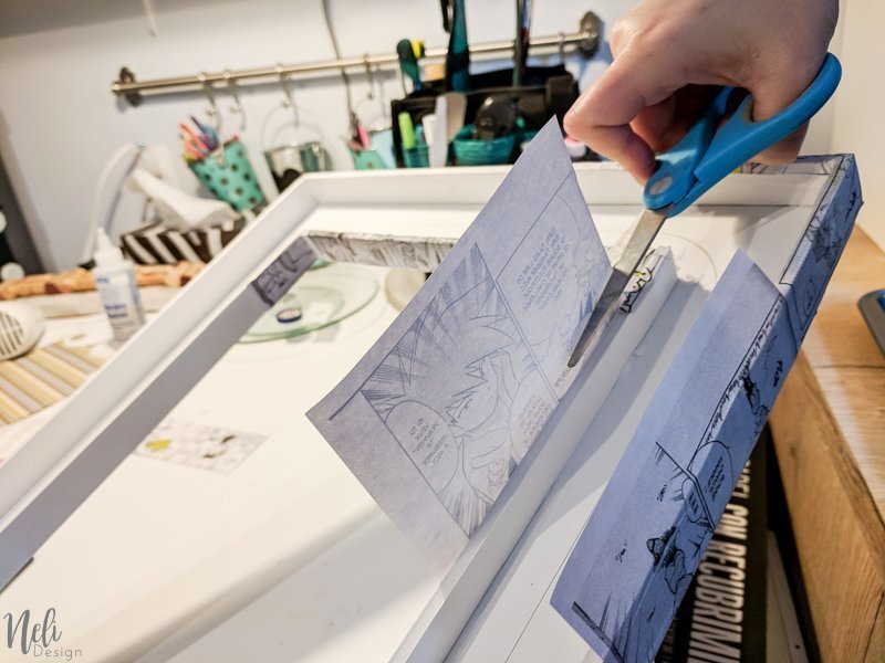 Pour décorer le cadre, il suffit de mettre du Mod Podge, coller le papier et rajouter du Mod Podge par dessus. Tourner le cadre à l'envers et découper ce qui dépasse en trop. Replier le papier vers l'intérieur et bien le coller avec du Mod Podge.