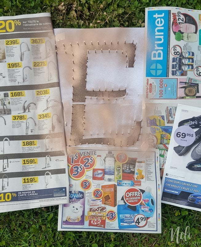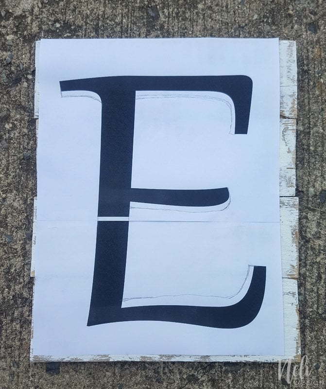 Je suis allée dans Photoshop et imprimé un « E » la bonne taille pour la grandeur des planche (j'ai du imprimer 2 fois le format lettre en paysage) et j'ai fixé le papier sur la planche avec quelques morceaux de ruban adhésif.