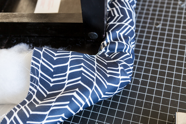 Once they were done, I flipped it over to make sure it was straight (the fabric I chose was not the easiest one to cover a square stool. I hat to make sure the lines were parallel to the stool.